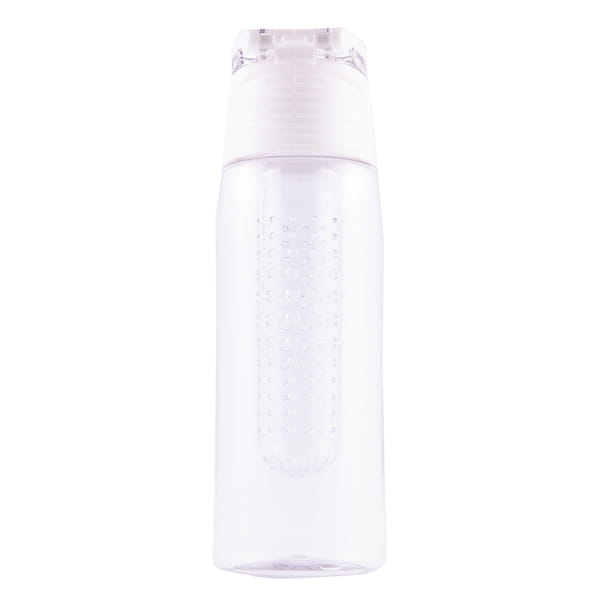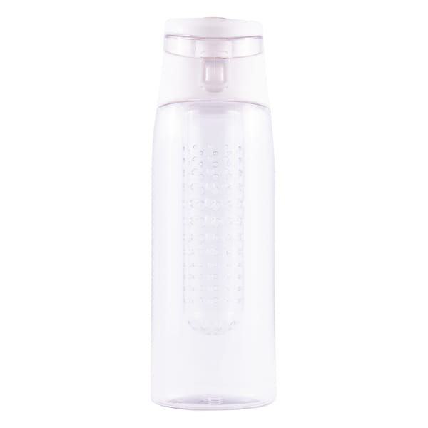 Lekki, szczelny bidon z solidnym zamknięciem, wyposażony w pojemnik na kawałki owoców lub miętę. Wykonany z tritanu - wytrzymałego, przezroczystego tworzywa niezmieniającego smaku napoju. Wolny od BPA.