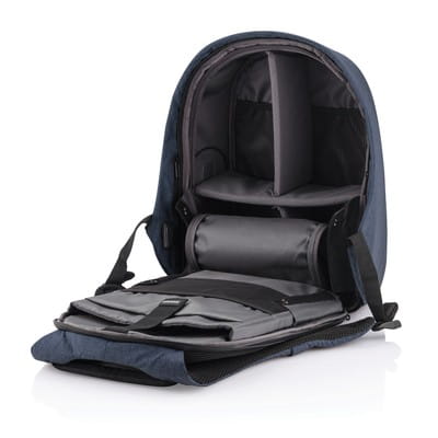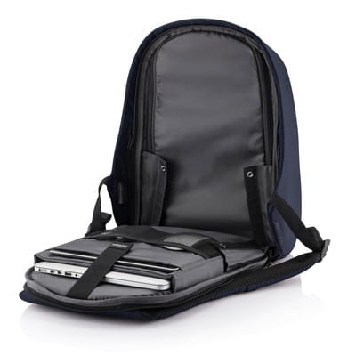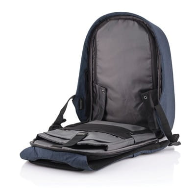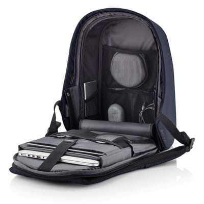 Plecak chroniący przed kieszonkowcami Bobby Hero Regular, wodoodporny i odporny na przecięcia materiał, wykonany z materiału rPET, ukryte zamki i kieszenie, wewnątrz miękkie przegrody na laptopa 15,6" i tablet do 12,9", zintegrowany port USB do ładowania telefonów (power-bank nie jest dołączony), odblaskowe paski zwiększające widoczność, pasek do zamocowania na walizce, wzór zastrzeżony®