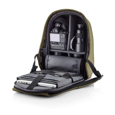 Plecak chroniący przed kieszonkowcami Bobby Hero Regular, wodoodporny i odporny na przecięcia materiał, wykonany z materiału rPET, ukryte zamki i kieszenie, wewnątrz miękkie przegrody na laptopa 15,6" i tablet do 12,9", zintegrowany port USB do ładowania telefonów (power-bank nie jest dołączony), odblaskowe paski zwiększające widoczność, pasek do zamocowania na walizce, wzór zastrzeżony®