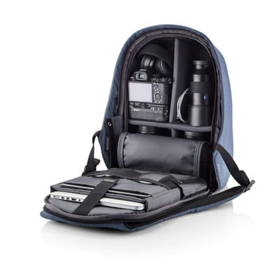 Plecak chroniący przed kieszonkowcami Bobby Hero Regular, wodoodporny i odporny na przecięcia materiał, wykonany z materiału rPET, ukryte zamki i kieszenie, wewnątrz miękkie przegrody na laptopa 15,6" i tablet do 12,9", zintegrowany port USB do ładowania telefonów (power-bank nie jest dołączony), odblaskowe paski zwiększające widoczność, pasek do zamocowania na walizce, wzór zastrzeżony®