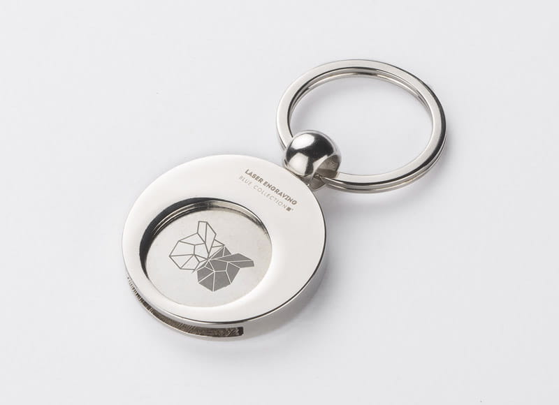 Brelok metalowy wraz z żetonem, o chromowanej powierzchni. Sam żeton pasuje do wózków sklepowych. Grawer wykonujemy na żetonie. Żeton jest średnicy 1 Euro.