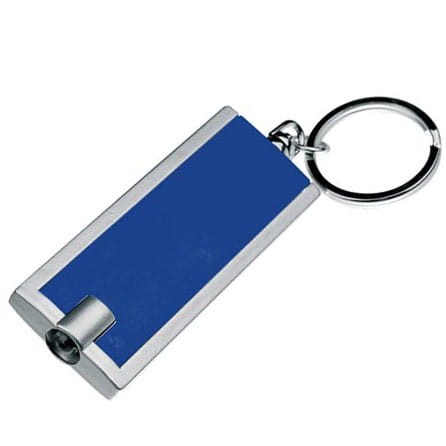 Płaski, prostokątny brelok do kluczy o nowoczesnym wyglądzie, z wbudowaną latarką LED o białym świetle. Produkt zawiera baterie.