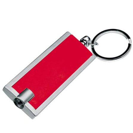 Płaski, prostokątny brelok do kluczy o nowoczesnym wyglądzie, z wbudowaną latarką LED o białym świetle. Produkt zawiera baterie.