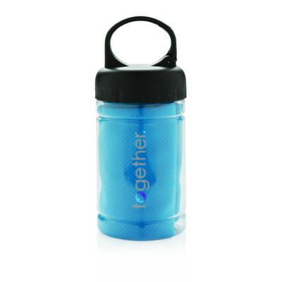Chłodzący ręcznik | Ręcznik chłodzący w 100% wolny od substancji chemicznych, mikrofibra, posiada funkcję ochrony przeciwsłonecznej - blokuje promienie słoneczne na poziomie 98% i do UV 50+. Wystarczy wlać zimnej wody do pojemnika, co doda ręcznikowi funkcję chłodzenia, i szybki sposób na odświeżenie gotowy. Pojemnik wykonany z PP, górna część ABS, posiada karabińczyk, dzięki czemu można go zabrać ze sobą podczas aktywności na świeżym powietrzu.