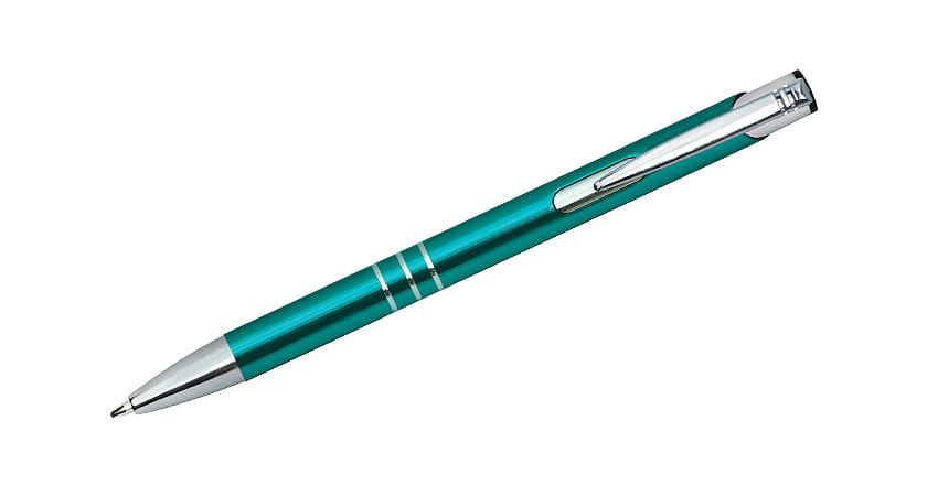 Metalowy długopis KALIPSO o metalizowanej chromowanej powierzchni. Długopis automatyczny z 3 ringami i niebieskim wkładem.