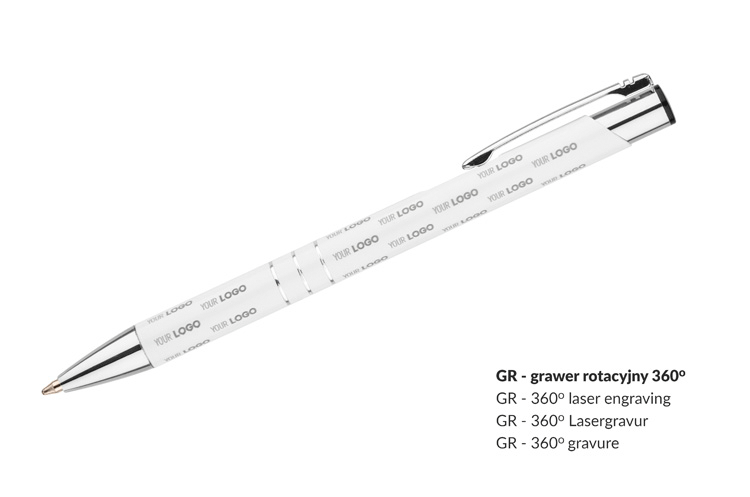 Długopis automatyczny z 3 ringami i niebieskim wkładem. Tradycyjny model metalowego długopisu dzięki pokryciu lakierem w żywym kolorze uzyskał zupełnie nowy wygląd. Wygrawerowane logo, będzie wyglądało bardzo efektownie i estetycznie. Logo grawerujemy na powierzchni długopisu.