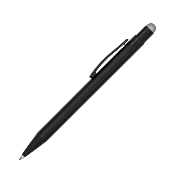 Długopis z czarnym korpusem i kolorową końcówką do ekranów dotykowych. Niebieski wkład.