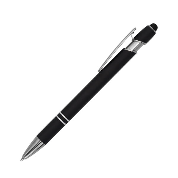 Aluminiowy długopis o przyjemnym w dotyku, satynowym wykończeniu ze srebrnymi elementami. Wyposażony w końcówkę do ekranów dotykowych. Niebieski wkład.