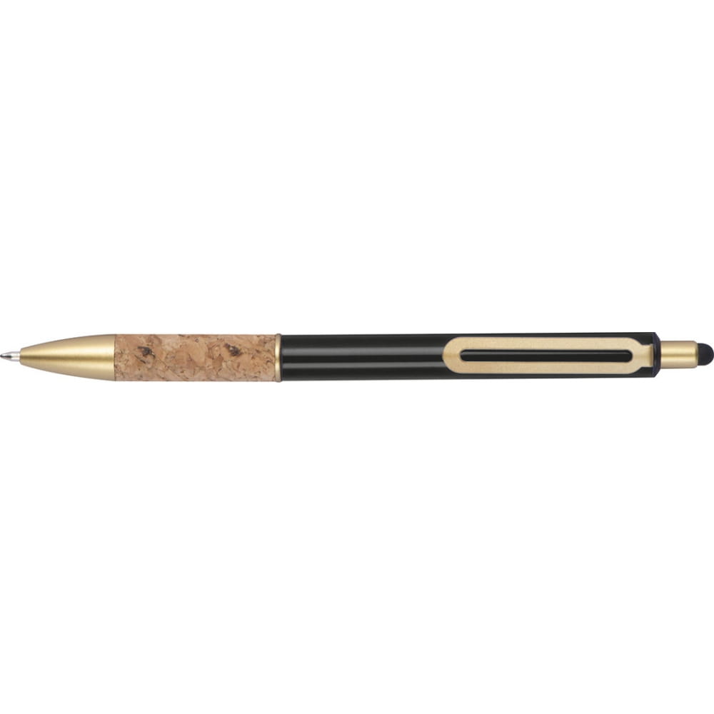 Metalowy długopis ze złotymi elementami i korkową strefą uchwytu. Długopis pisze na niebiesko.