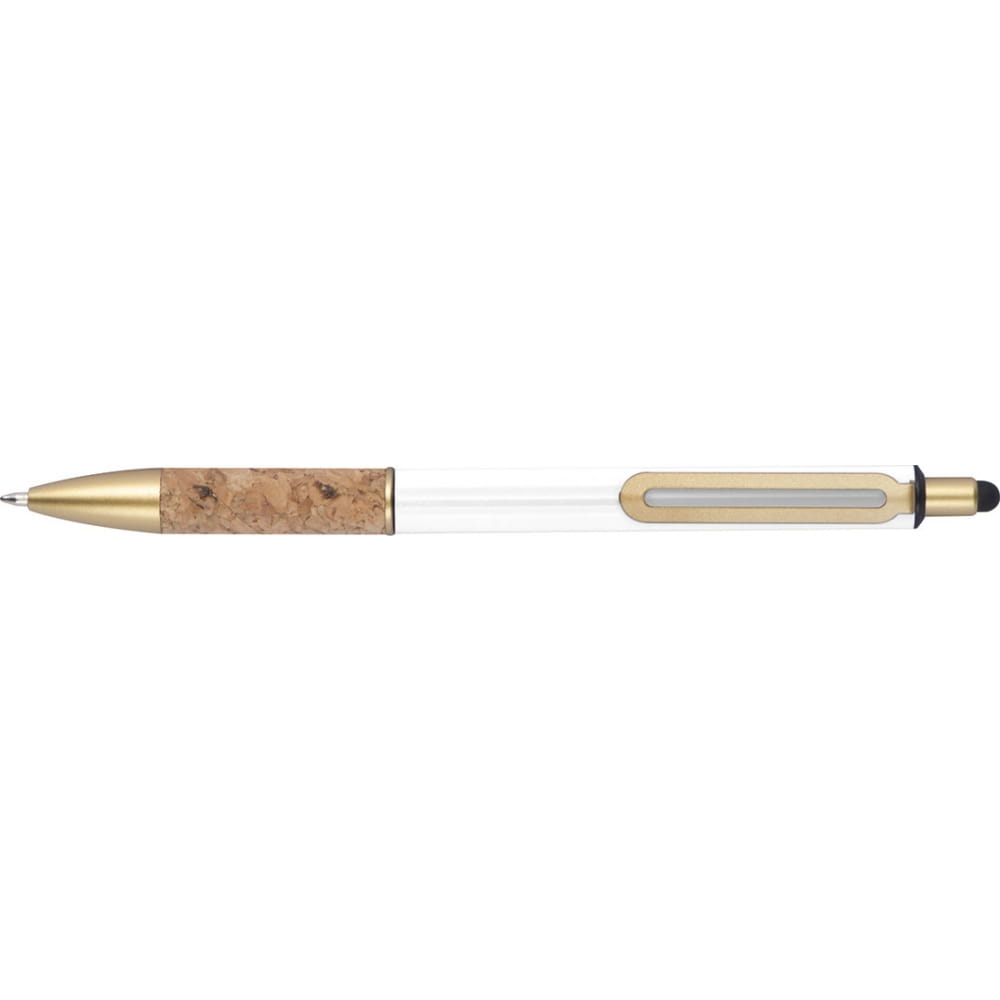 Metalowy długopis ze złotymi elementami i korkową strefą uchwytu. Długopis pisze na niebiesko.
