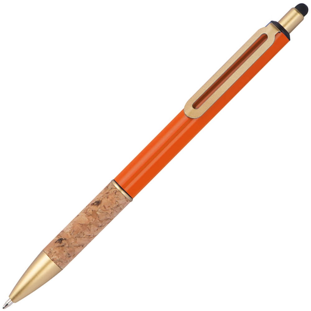 Metalowy długopis ze złotymi elementami i korkową strefą uchwytu. Długopis pisze na niebiesko.