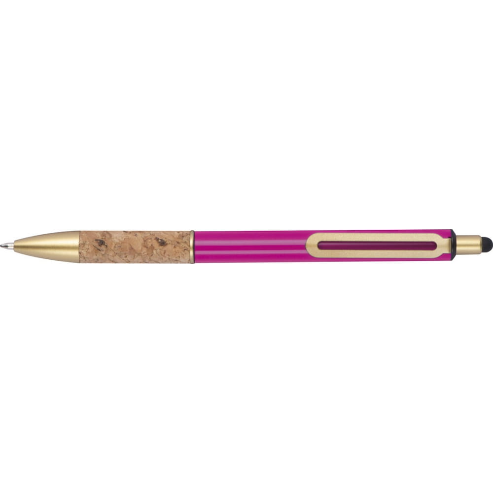 Metalowy długopis ze złotymi elementami i korkową strefą uchwytu. Długopis pisze na niebiesko.