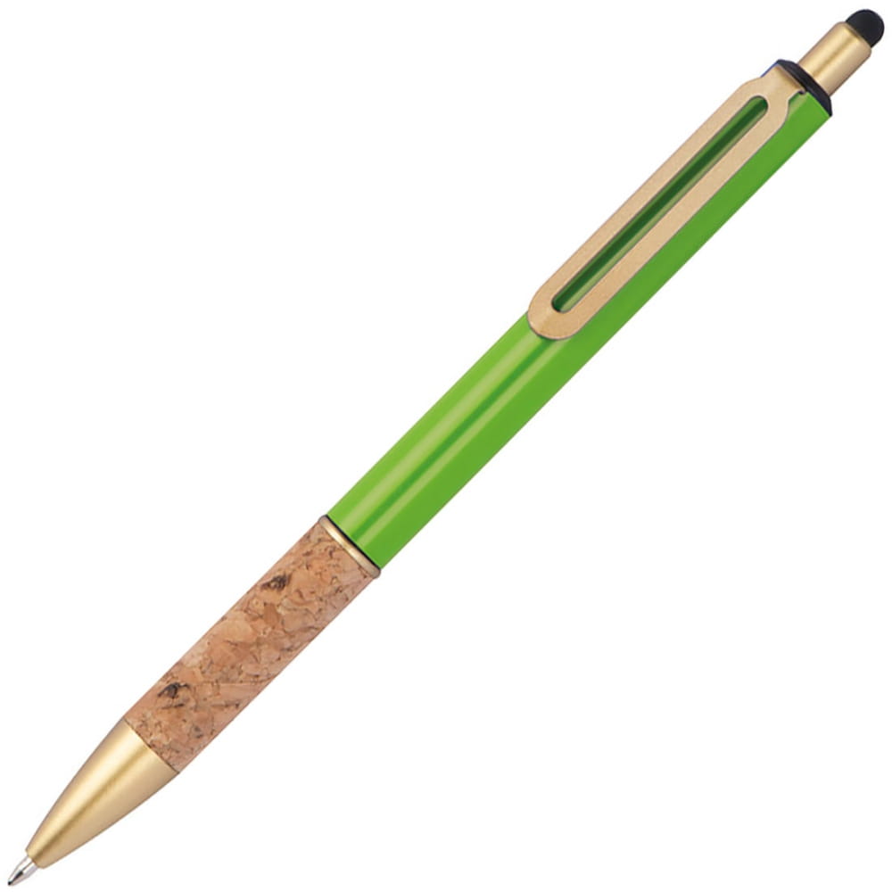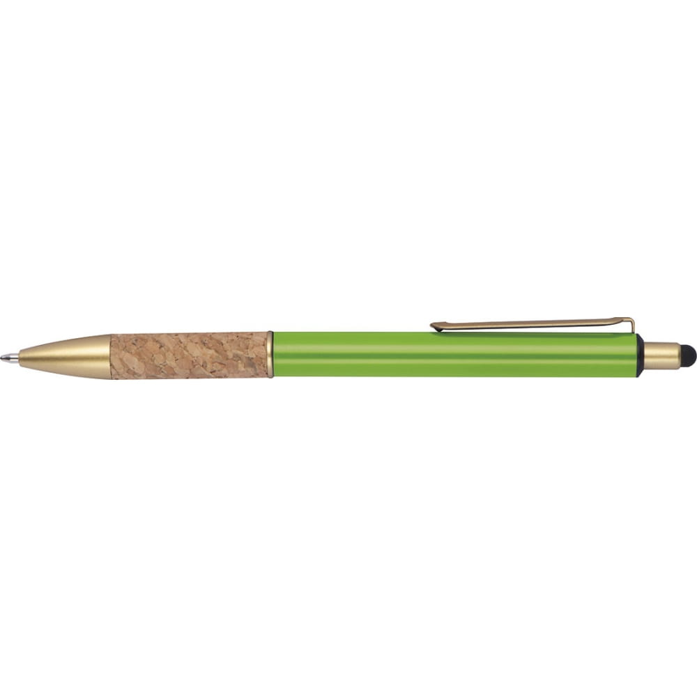 Metalowy długopis ze złotymi elementami i korkową strefą uchwytu. Długopis pisze na niebiesko.