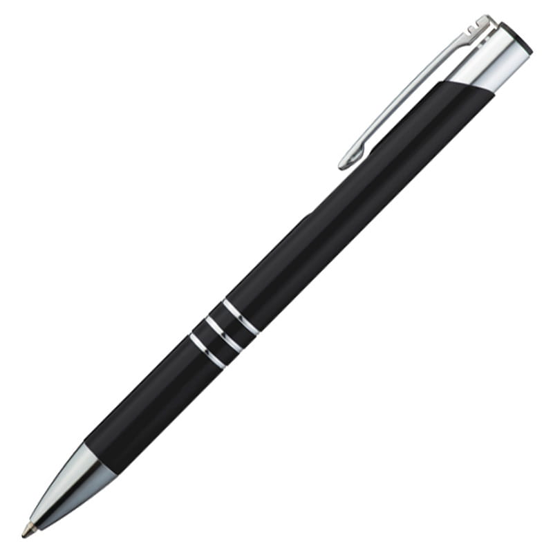 Klasyczny długopis metalowy z chromowanymi wykończeniami i smukłym klipem. Długopis wyposażony w duży niebieski wkład piszący na niebiesko.