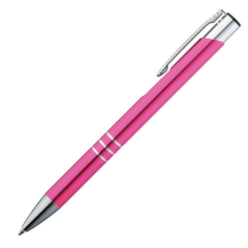 Klasyczny długopis metalowy z chromowanymi wykończeniami i smukłym klipem. Długopis wyposażony w duży niebieski wkład piszący na niebiesko.