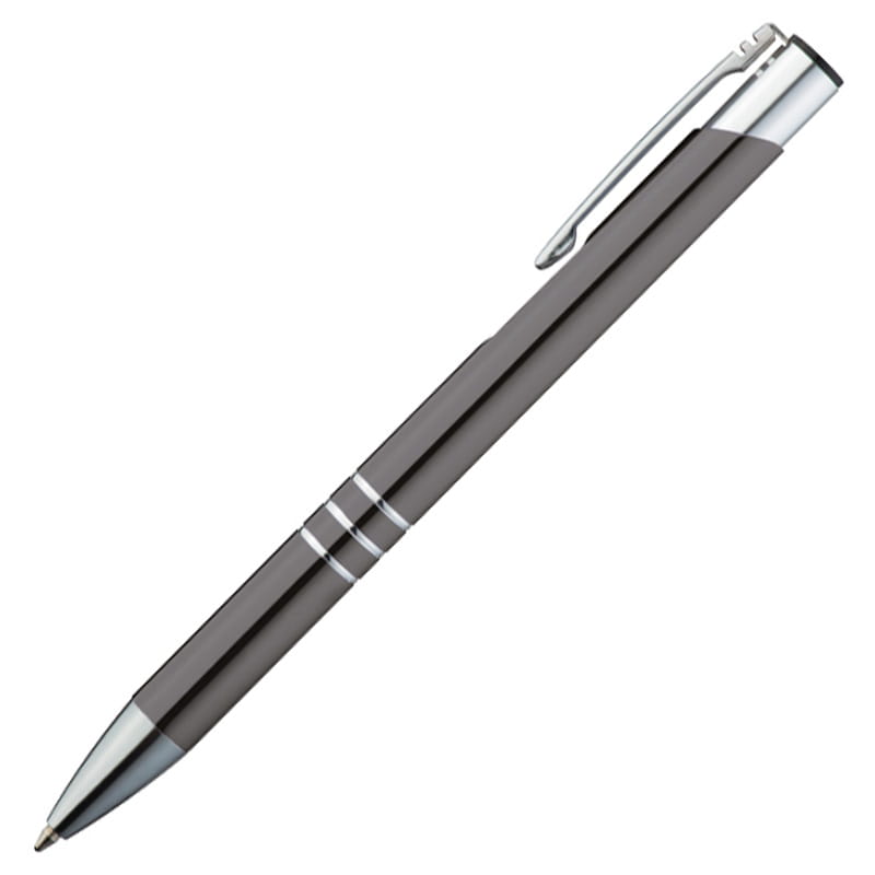 Klasyczny długopis metalowy z chromowanymi wykończeniami i smukłym klipem. Długopis wyposażony w duży niebieski wkład piszący na niebiesko.