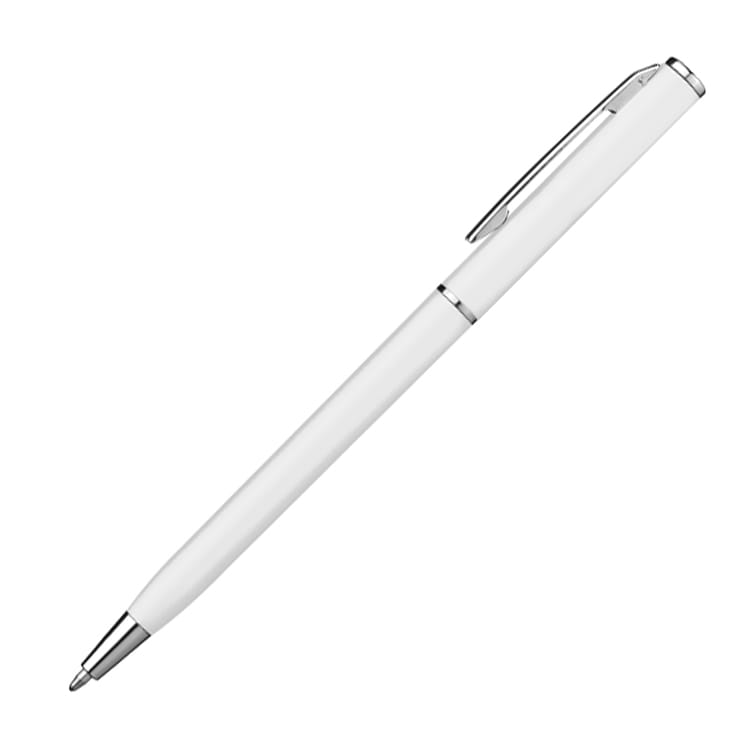 Smukły długopis plastikowy z mechanizmem obrotowym i wkładem piszącym na niebiesko.
