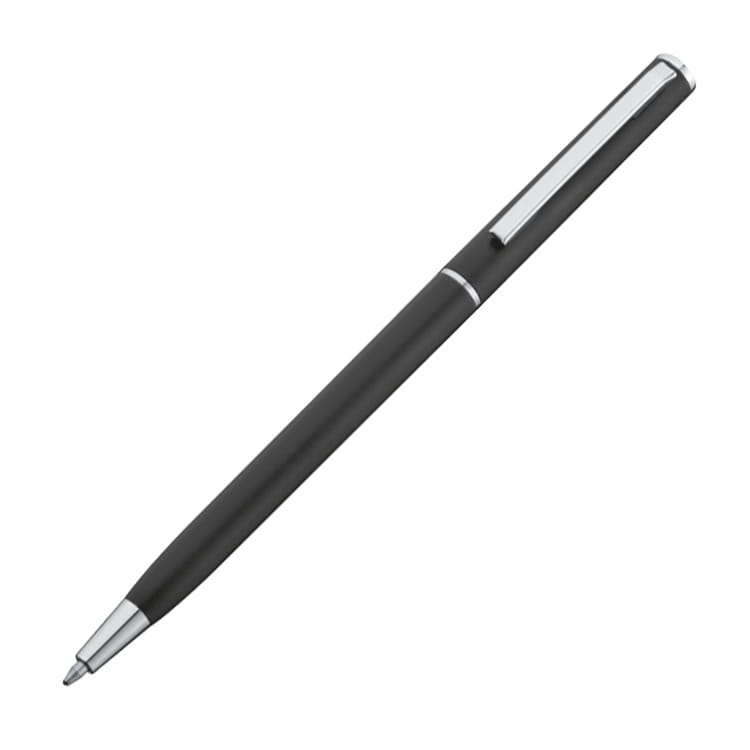 Smukły długopis plastikowy z mechanizmem obrotowym i wkładem piszącym na niebiesko.