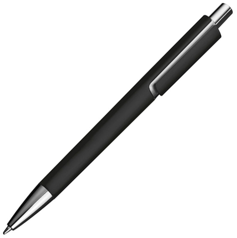 Plastikowy długopis z wkładem piszącym na niebiesko i srebrną aplikacją pod klipem.