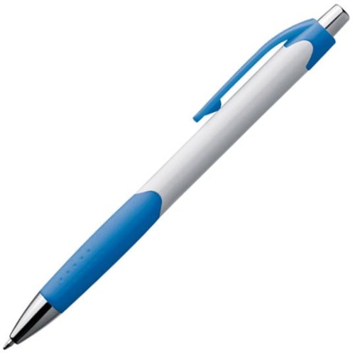 Długopis plastikowy, wyposażony w klip i gumkę ułatwiającą pisanie oraz niebieski wkład.