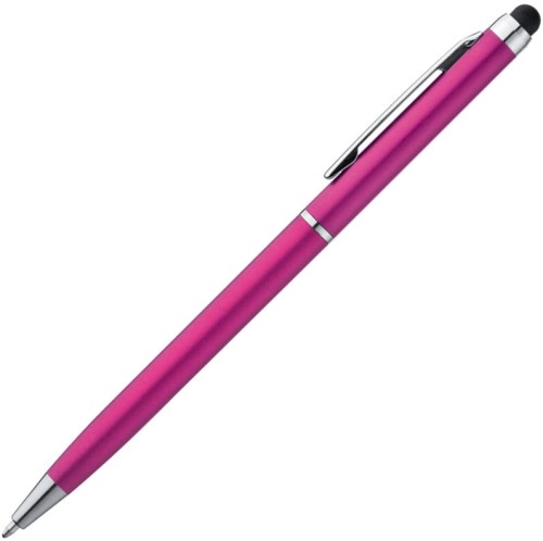 Elegancki, smukły długopis plastikowy z mechanizmem obrotowym. Posiada wkład piszący na niebiesko oraz praktyczną gumkę ułatwiającą korzystanie ze smartfonów i tabletów.