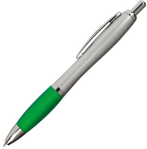 Popularny, plastikowy długopis z satynowym połyskiem, wyposażony w metalowy klip, gumkę ułatwiającą pisanie oraz duży, niebieski wkład.