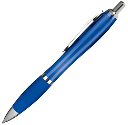 Plastikowy długopis transparentny z dużym, niebieskim wkładem. Produkt wyposażony w srebrny, metalowy klip oraz gumkę ułatwiającą trzymanie.