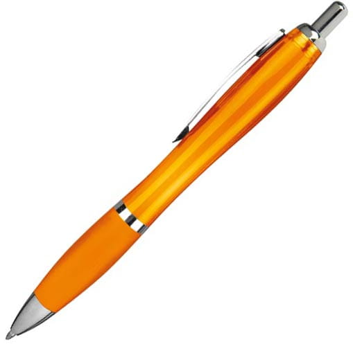 Plastikowy długopis transparentny z dużym, niebieskim wkładem. Produkt wyposażony w srebrny, metalowy klip oraz gumkę ułatwiającą trzymanie.