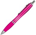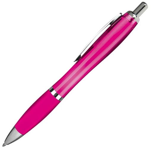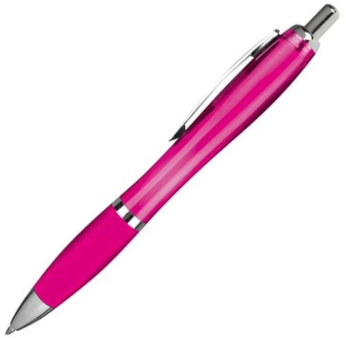 Plastikowy długopis transparentny z dużym, niebieskim wkładem. Produkt wyposażony w srebrny, metalowy klip oraz gumkę ułatwiającą trzymanie.