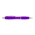 Plastikowy długopis transparentny z dużym, niebieskim wkładem. Produkt wyposażony w srebrny, metalowy klip oraz gumkę ułatwiającą trzymanie.