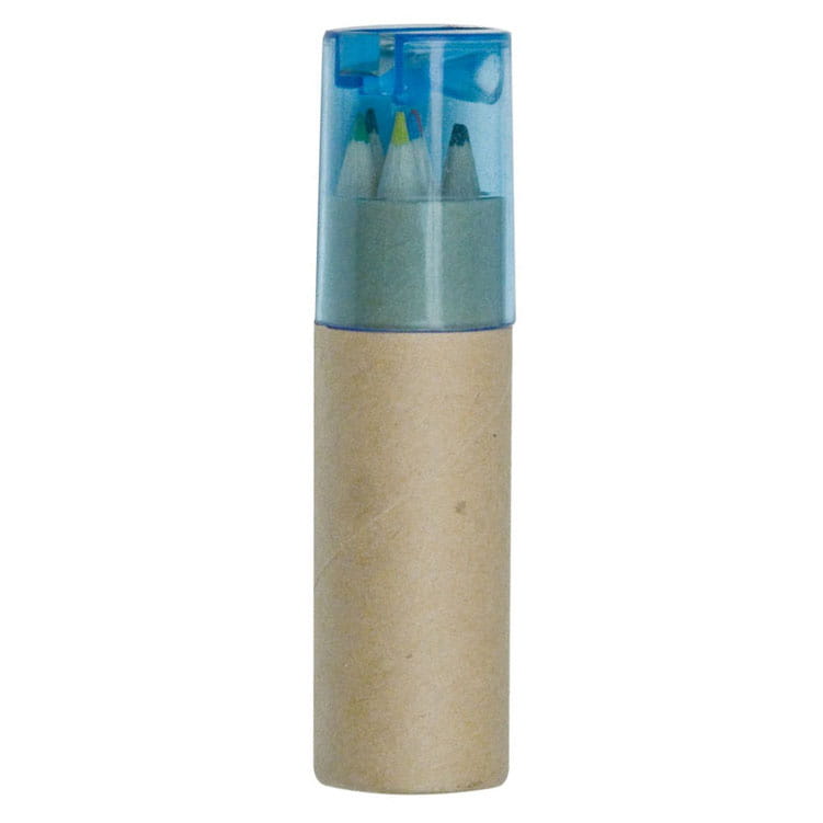 Oto najbardziej odpowiedni zestaw do rysowania dla najmłodszych, z 6 krótkimi, grubymi kredkami oraz temperówką w niebieskiej, transparentnej pokrywce.