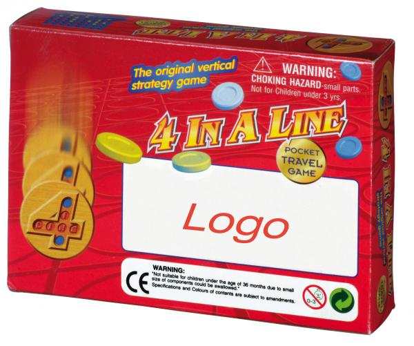 Gra podróżna 4 IN A LINE z czerwonymi i żółtymi tokenami, pakowane w pudełko.