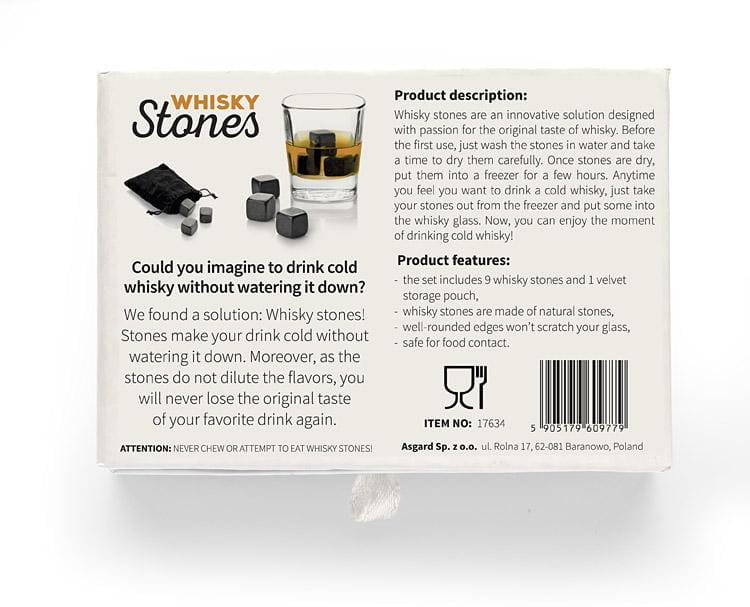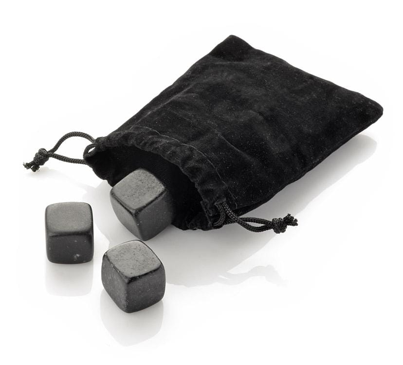 Kamienie do whisky - zupełna nowość na rynku - gadżet dla wymagających klientów, w szczególności dla koneserów whisky. Ten zestaw 9 specjalnych kamieni zastępuje kostki lodu. Kostki należy umieścić na minimum 4 godziny w zamrażalniku, aby uzyskały pożądaną temperaturę. Po wyjęciu można ich użyć zamiast kostek lodu. Najważniejsze zalety tego rozwiązania w porównaniu do kostek lodu to: nie rozcieńczają napoju, można je wykorzystać wielokrotnie, są niezwykle oryginalne. Kostki wykonane są z naturalnego bazaltu. Produkt posiada atest dopuszczający do kontaktu z żywnością.