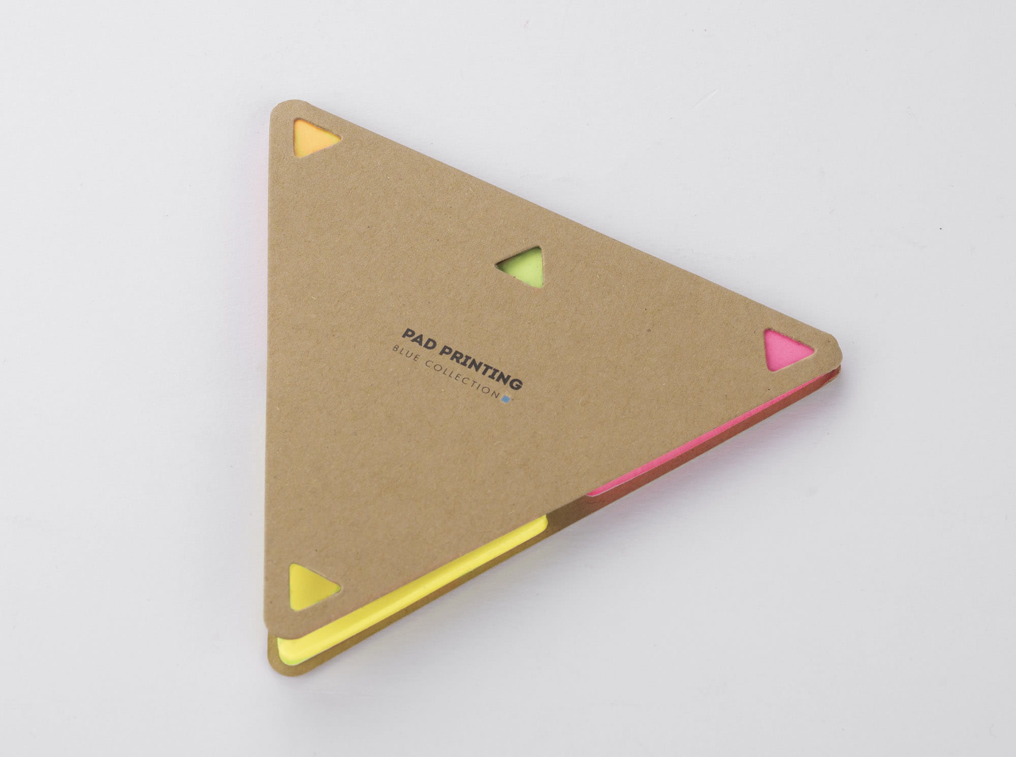 Karteczki samoprzylepne PEL w kształcie trójkąta z ekologiczną papierową okładką. Wewnątrz znajduje się 25 sztuk karteczek w 4 kolorach: pomarańczowym, różowym, zielonym, żółtym.