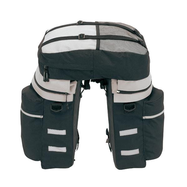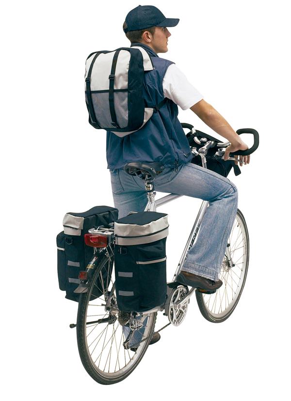 3-częściowy komplet bagażowy na rower Bike , zawierający 2 boczne torby z odblaskami , zamykane na zamki błyskawiczne, z osłoną przeciwdeszczową, plecak z regulowanymi paskami na ramiona.