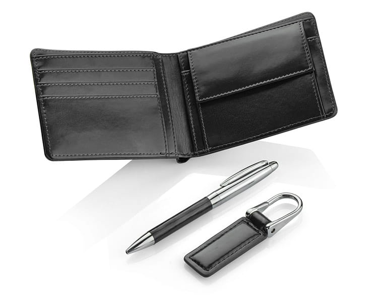 Komplet upominkowy zawierający portfel, brelok oraz metalowy długopis. Portfel wykonany z ekoskóry zawiera 2 przegródki na banknoty, kieszeń na bilon oraz dodatkowe kieszenie na karty kredytowe czy paragony. Całość zapakowana w eleganckie czarne pudełko.