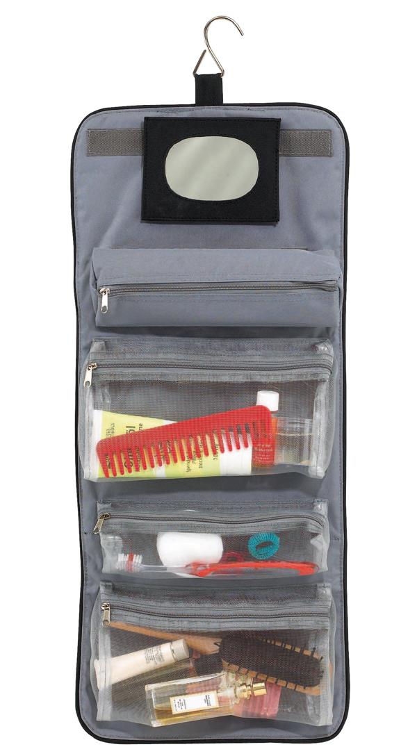 Kosmetyczka Star z 5 kieszeniami na zamki błyskawiczne, odpinanym lusterkiem, uchwytem i metalowym haczykiem do wieszania.