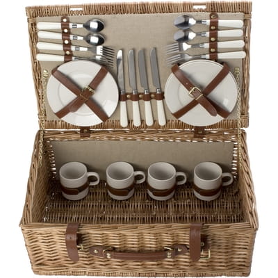 Kosz piknikowy z nakryciem dla 4 osób, zawiera: sztućce ze stali nierdzewnej z plastikowymi uchwytami, 4 ceramiczne talerze, 4 ceramiczne kubki 210 ml