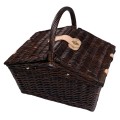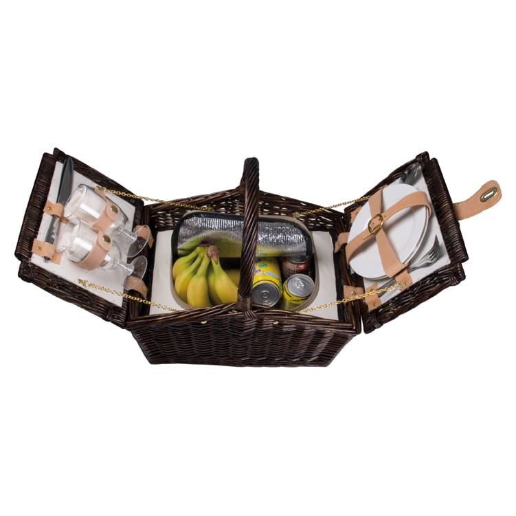 Koszyk piknikowy dla dwóch osób, zaopatrzony w plastikowe kieliszki, porcelanowe talerze, sztućce oraz nóż kelnerski. Dodatkowo torbę wyposażono w komorę chłodzącą.