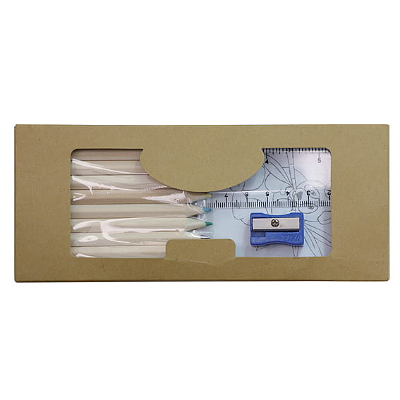 Zestaw małego artysty zawierający kolorowankę, dziesięć drewnianych kredek, linijkę oraz temperówkę.