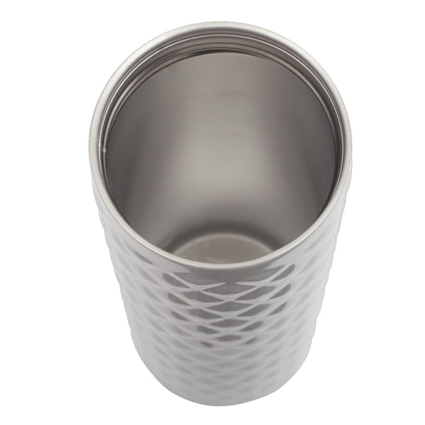 Wykonany ze stali nierdzewnej, pokrytej błyszczącym lakierem, kubek izotermiczny ? termos o pojemności 450 ml. Oryginalna pikowana powierzchnia. Wewnętrzna ścianka wykonana ze stali o podwyższonej jakości 18/8. Próżnia pomiędzy ściankami zapewnia bardzo dobre właściwości termoizolacyjne. Pakowany w białe kartonowe pudełko.