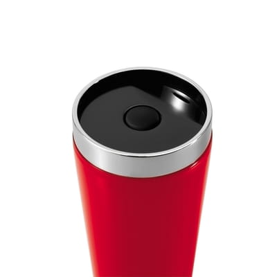 Kubek podróżny 350 ml ze stali nierdzewnej, wewnątrz PP, z pokrętką na pokrywie i przyciskiem zamykającym, zapobiegającym wylaniu, nie wymaga obsługi oburącz, klasa termiczna: 1 +leakproof