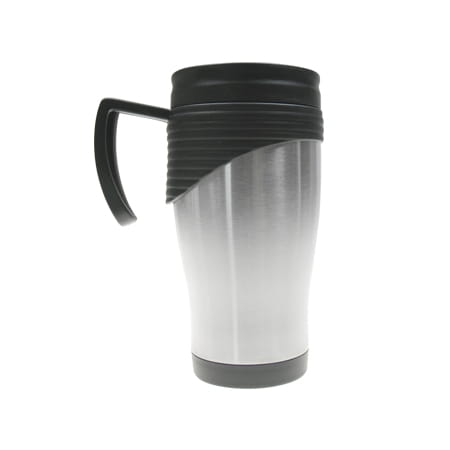 Kubek termiczny o pojemności 400 ml, wykonany ze stali szlachetnej z zewnątrz i plastiku w środku.