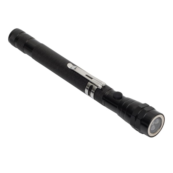 Metalowa wysuwana latarka. Teleskop o długości 38,5 cm. Wyposażona w 3 białe diody LED, o sumarycznym strumieniu światła 30 lumenów. Zaopatrzona w klips oraz magnesy na obu końcach. Zasilana 4 bateriami typu AG13 (dołączone).
