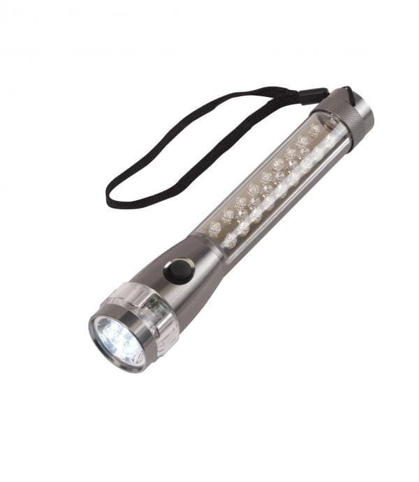 Latarka LED FLASH , 7 białych i 3 czerwone diody LED w głowicy, 18 białych i 6 czerwonych diod LED w uchwycie, 3 tryby świecenia, z magnesem na końcu, gumowany przycisk on/off, obudowa z lekkiego i wytrzymałego aluminium, nylonowy pasek.