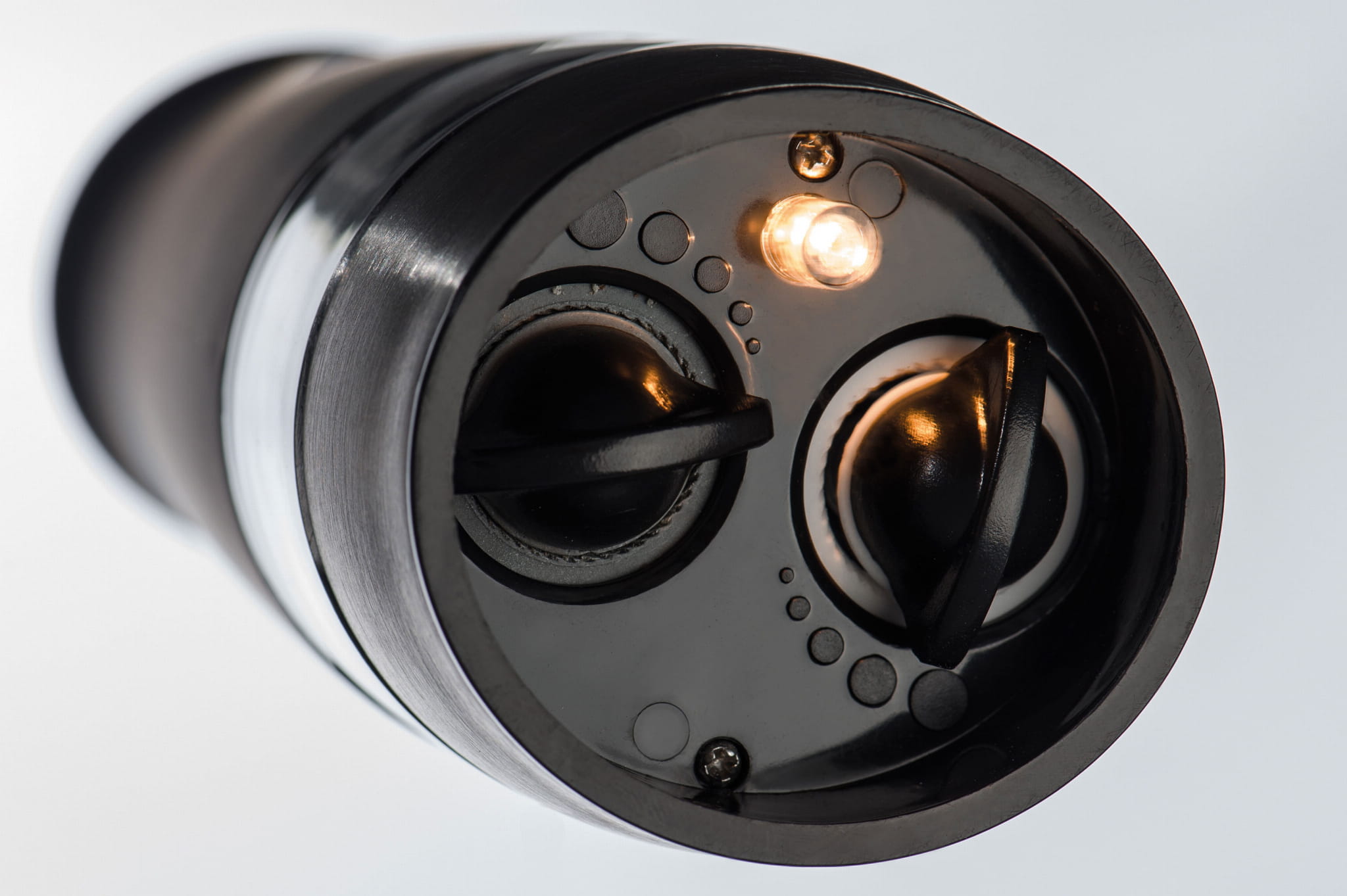 Elektryczny młynek do soli i pieprzu. Posiada dwie oddzielne komory, które mogą być niezależnie obsługiwane za pomocą przycisków.