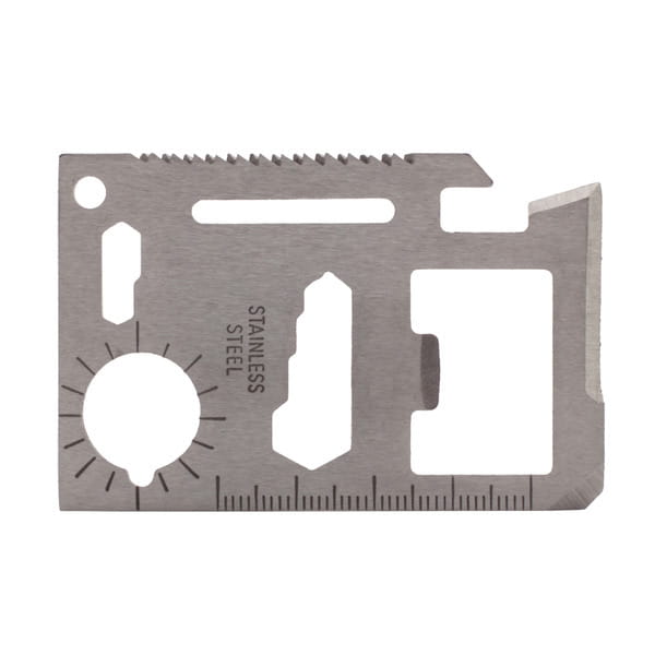 Metalowe narzędzie w kształcie karty. Zawiera : otwieracz do konserw, nóż, otwieracz do butelek, miarkę, klucz oczkowy (4 rozmiary), klucz do nakrętek motylkowych, piłę, kątomierz, klucz płaski (2 rozmiary), klucz do zaginania drutu. Pakowane w etui z ekoskóry.