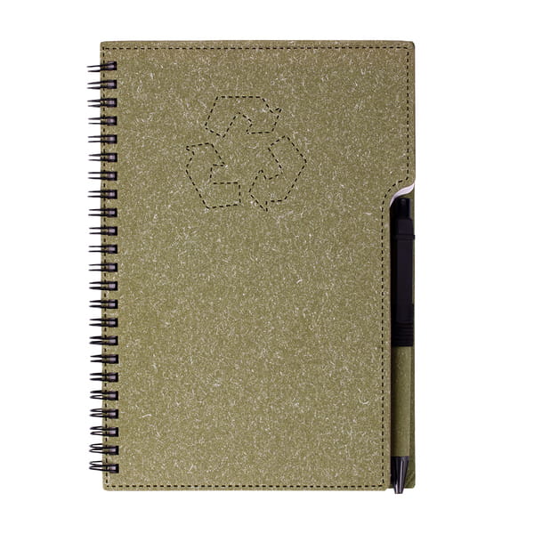 Eko notes w twardej oprawie z dołączonym długopisem w rozmiarze biurkowym (zbliżony do A5 lub większy). 70 kartek w linie (z perforacją), gramatura 70 g/m². Zarówno oprawa jak i papier wykonane zostały z surowców wtórnych. Nadają się one także do kolejnego przetworzenia. Korpus długopisu wykonany z tektury, klip, końcówka i przycisk wykonane z plastiku nadającego się do recyclingu, wkład w kolorze niebieskim. Notes posiada uchwyt na długopis.