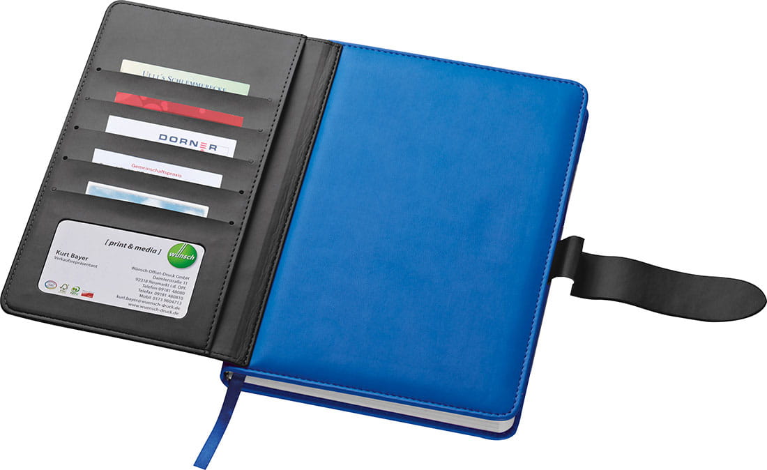 Notatnik format A5 ze 128 kartkami w linie i wizytownikiem na 5 wizytówek. Produkt sprzedawany bez artykułów piśmiennych.