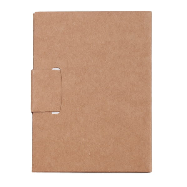 Mini notatnik w okładce z papieru o gramaturze 500 g/m2. 100 białych gładkich kartek (80 g/m2), 5 x 25 szt. karteczek samoprzylepnych (80 g/m2) oraz kartonowy mini-długopis z plastikowymi elementami.